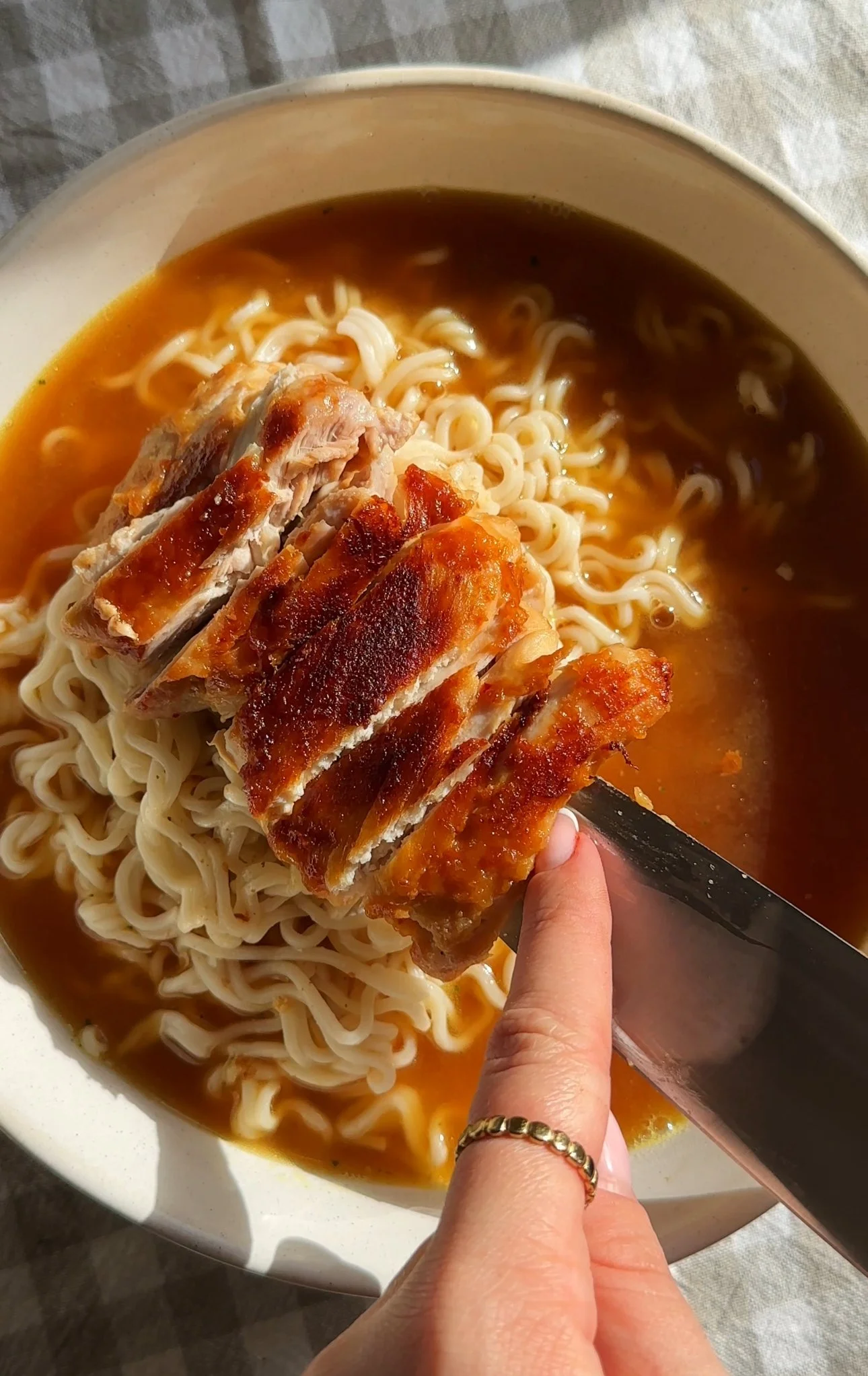 Noodles, broth, protein and vegetables is my most frequented combination for dinner. I call it ramen for ease, but really, it’s brothy noodles with a few delicious toppings. Ramen-making is a curated skill and art to master, and usually takes hours in the double digits to create. This is a sort of nod to ramen but is more suited to weeknight cooking for the average home cook. The broth for this miso and honey noodle soup/ramen is made with the marinade we cook the chicken thighs in and the fond that’s created as we cook said chicken. ‘Fond’ is simply a fancy French term used for the delicious, crispy and flavour-packed bits left at the bottom of the pan after you’ve roasted, seared or sautéed something. We simply add chicken stock to it in this case and you’re left with a simple but delicious broth with no extra effort. If you’re craving restaurant style chicken ramen but are short on time (or the want to cook), this is the recipe for you!