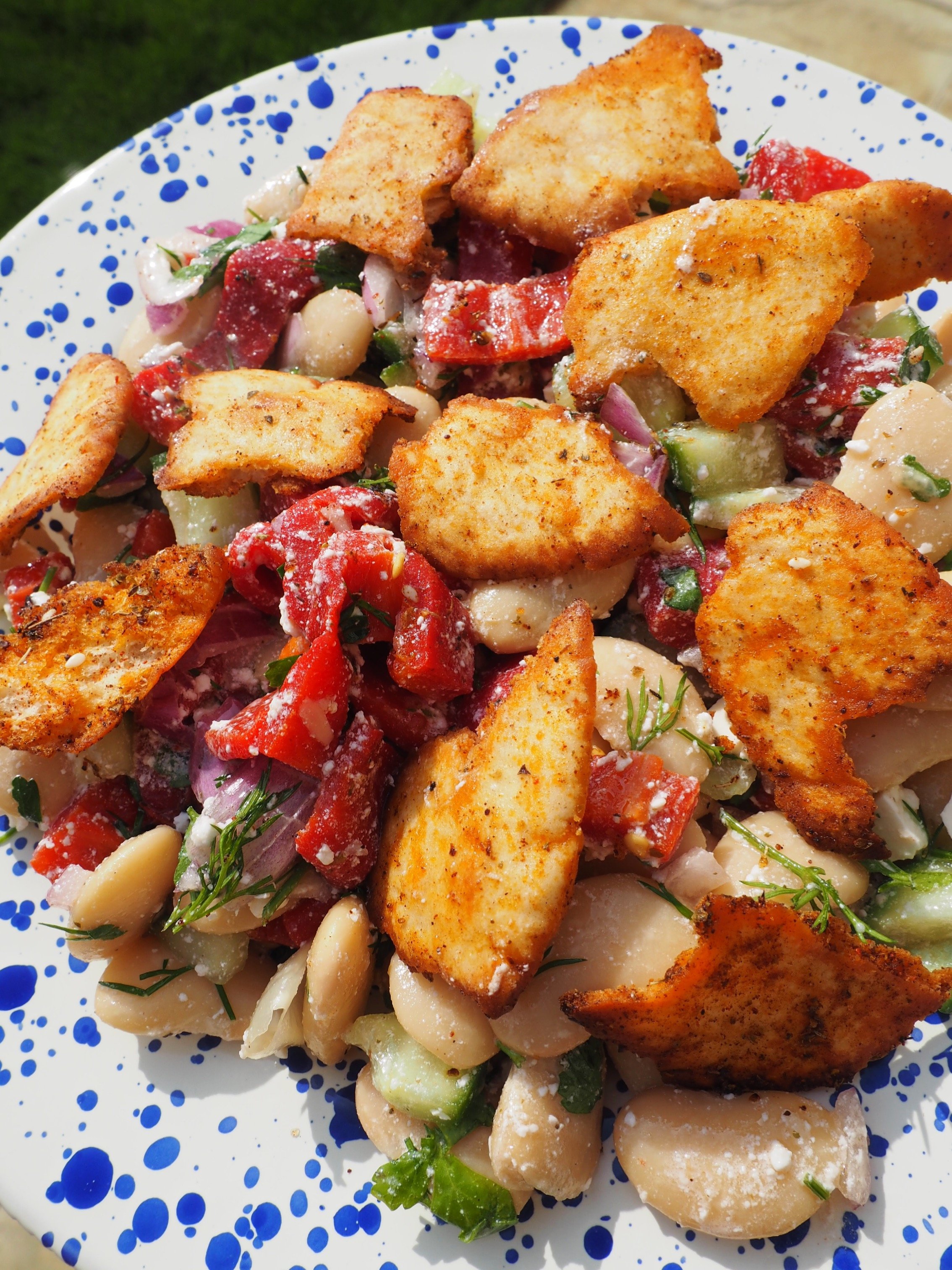 Limp and lifeless salads are out; vibrant, flavour and texture packed salads are in! This Mediterranean salad is what vegetarian salad dreams are made of. The spiced pitta croutons are something I like to serve with hummus for dipping, but they also work so well on salads.